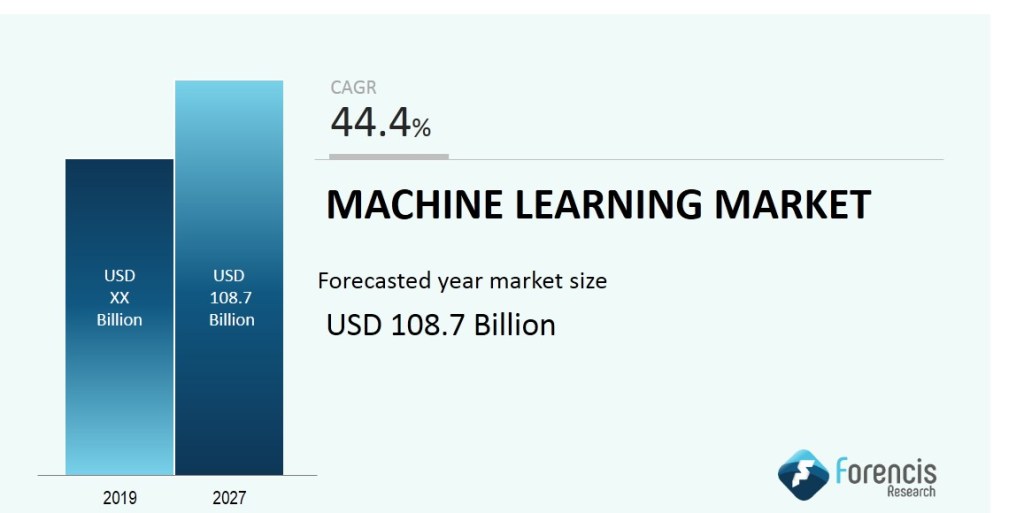 The Global Machine Learning Market is projected to reach a value of over USD 108.7 Billion by 2027 at a CAGR of around 44.4%.